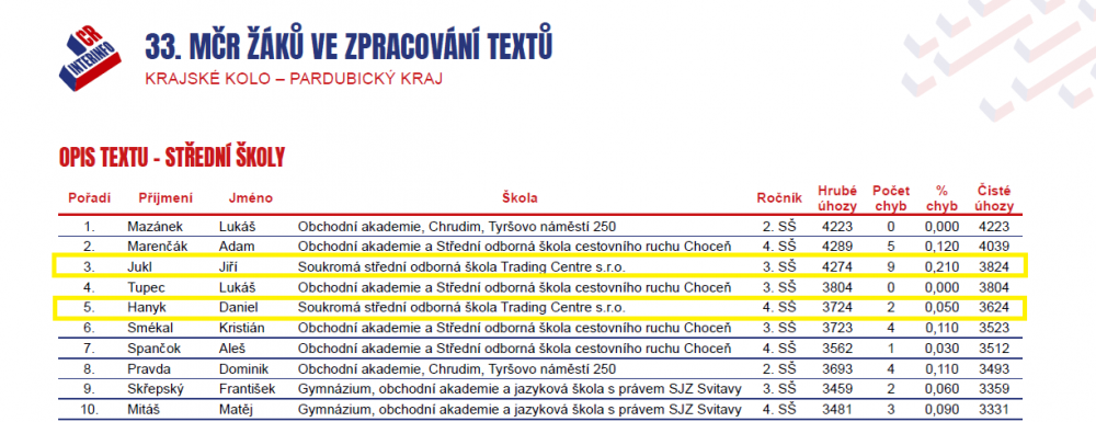 Všichni čtyři dosáhli skvělého výkonu, když pokořili hranici 300 čistých úhozů za minutu. Nejrychlejší byl Jiří Jukl, který svým výkonem 382 čistých úhozů za minutu splnil postupové limity a zajistil si nominaci do celostátního finále v Plzni.